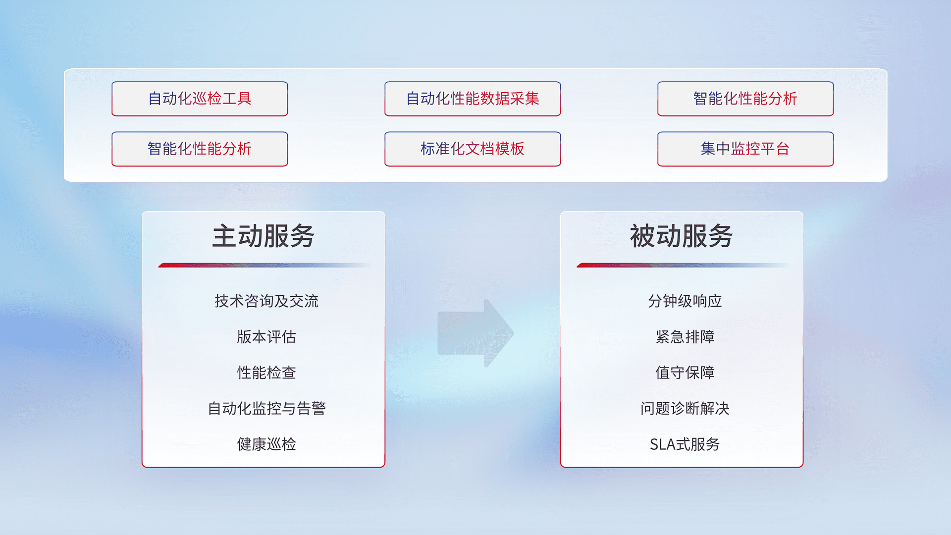 智能化工具和标准化文档,,保障服务质量,,提供主动服务(包含技术咨询、、、、版本评估、、、性能检查、、自动化监控与告警、、、、健康巡检)和被动服务包含(分钟级响应、、紧急排障、、、值守保障、、、、问题诊断解决、、SLA服务)。。。